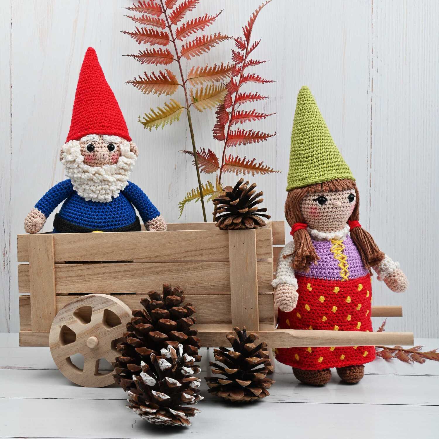 Haakpatroon kabouter vrouw gekleed in gestippelde rok en truitje met gerimpeld halsboordje. het kaboutermannetje heeft een gekrulde baard en broek met riem.