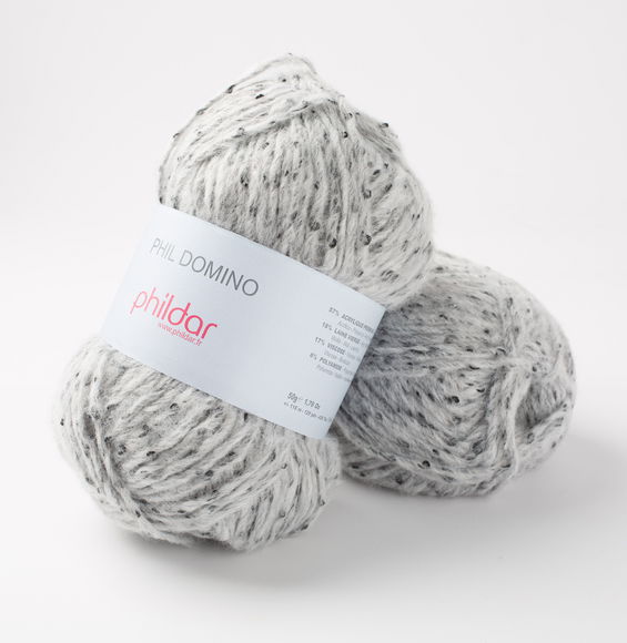 Phildar Phil Domino is een losjes gedraaide, wollige draad met een donkere afstekende binnenkern die om de centimeter een krul heeft. Breiwerk van het garen Domino hebben een vol en gemêleerd uiterlijk, kleding van deze draad is heerlijk warm en zacht en is licht in gewicht.