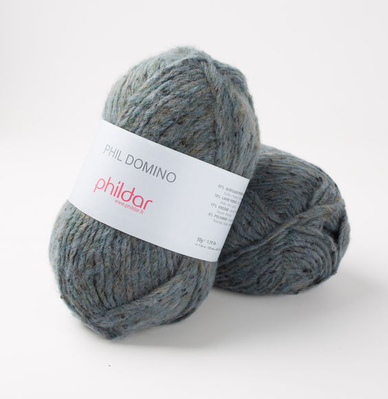 Phildar Phil Domino is een losjes gedraaide, wollige draad met een donkere afstekende binnenkern die om de centimeter een krul heeft. Breiwerk van het garen Domino hebben een vol en gemêleerd uiterlijk, kleding van deze draad is heerlijk warm en zacht en is licht in gewicht.