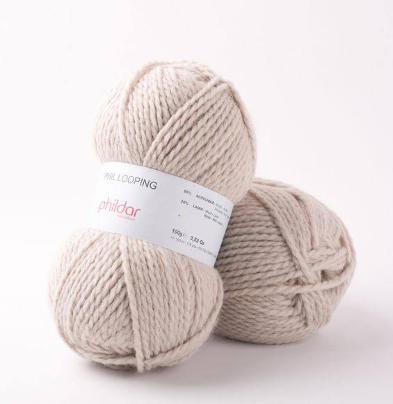 Phildar Phil Looping is een dikke, soepele draad die licht gedraaid is. Het garen is heerlijk zacht en licht in gewicht. Phil Looping is geschikt voor het breien en haken van kleding, accessoires en woondecoraties. De ronde draad geeft een duidelijk stekenpatroon, door zijn dikte kan er snel resultaat worden gemaakt.