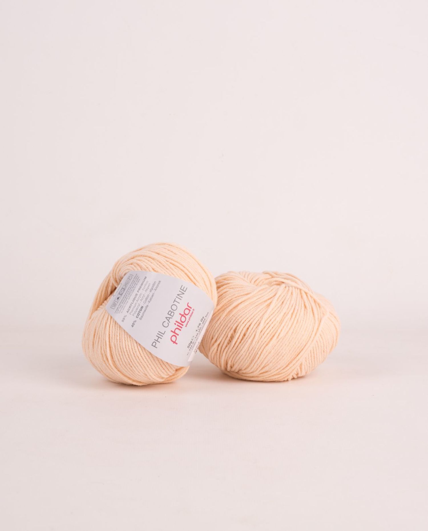 Cabotine van phildar is gemaakt van licht gebleekt katoen, dit geeft het garen een natuurlijke uitstraling. Daarnaast is voor meer elastisiteit acryl in de draad verwerkt. Het garen is zacht, stevig en geschikt om mee te haken en te breien. Cabotine is geschikt voor zowel zomer- als winterkleding, er staan veel patronen in de boeken van Phildar, een aantal patronen worden gratis bij het garen meegeleverd.