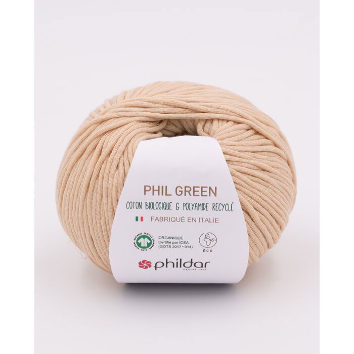 PHIL GREEN is een goed garen voor de planeet! Dit garen is gemaakt van 100% ecologische materialen : 70% biologisch katoen en 30% gerecycled polyamide. Het profiteert van de GOTS-certificering (Global Organic Textile Standard) die bevestigt dat het katoen biologisch is en wordt verbouwd op gecertificeerd land, vrij van giftige stoffen en allerlei soorten pesticiden en insecticiden. De gewatteerde buisvormige structuur geeft het garen een mooie ronding waardoor het breien gemakkelijker wordt.