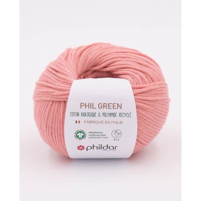 PHIL GREEN is een goed garen voor de planeet! Dit garen is gemaakt van 100% ecologische materialen : 70% biologisch katoen en 30% gerecycled polyamide. Het profiteert van de GOTS-certificering (Global Organic Textile Standard) die bevestigt dat het katoen biologisch is en wordt verbouwd op gecertificeerd land, vrij van giftige stoffen en allerlei soorten pesticiden en insecticiden. De gewatteerde buisvormige structuur geeft het garen een mooie ronding waardoor het breien gemakkelijker wordt.