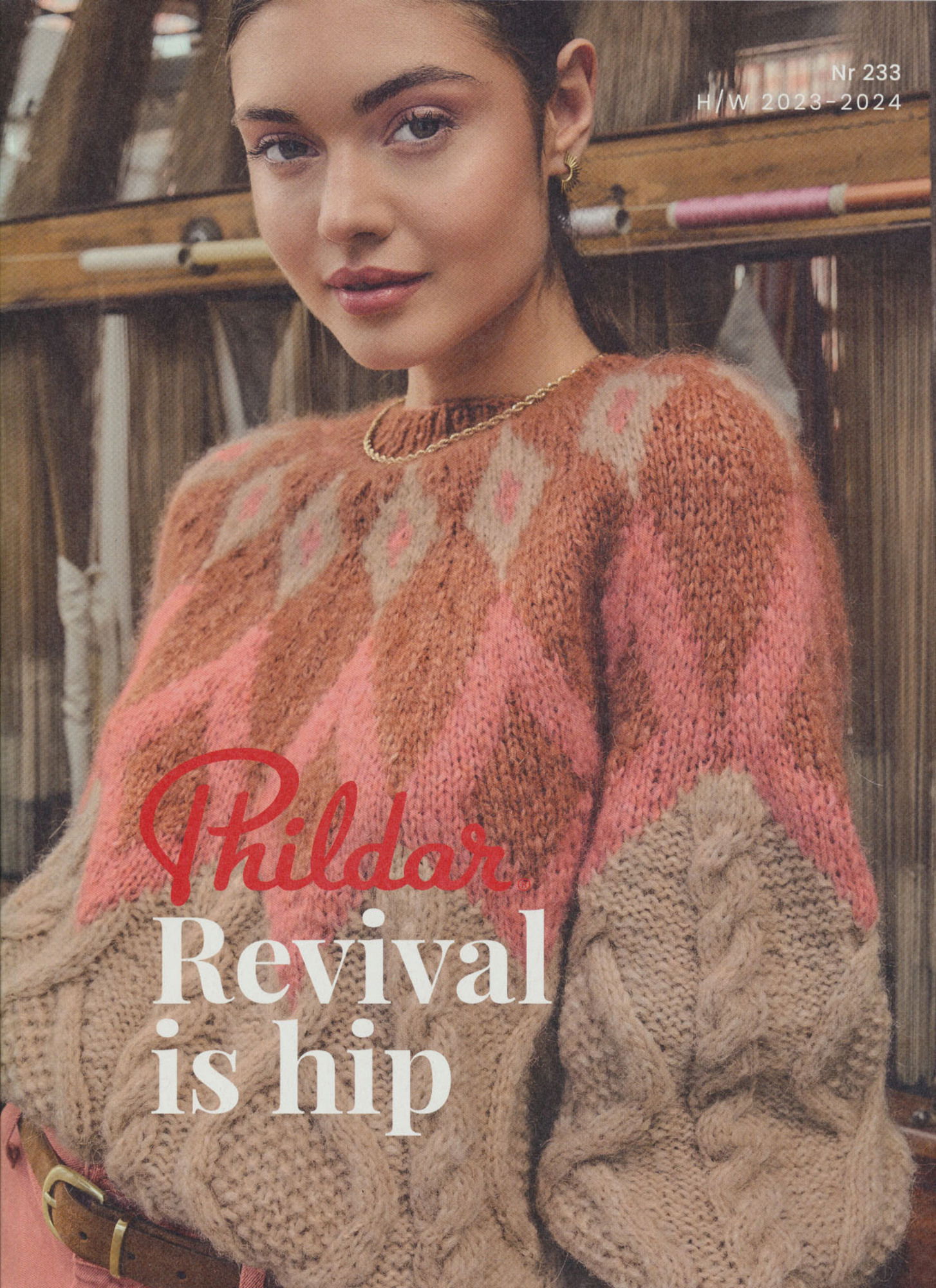 Phildar nr 233 Revival is hip, in het blad 23 breipatronen voor beginnende en ervaren breisters. Breipatronen voor het maken van damestruien en vesten, in tricotsteek, jacquard- , ajour- en kabelpatroon.