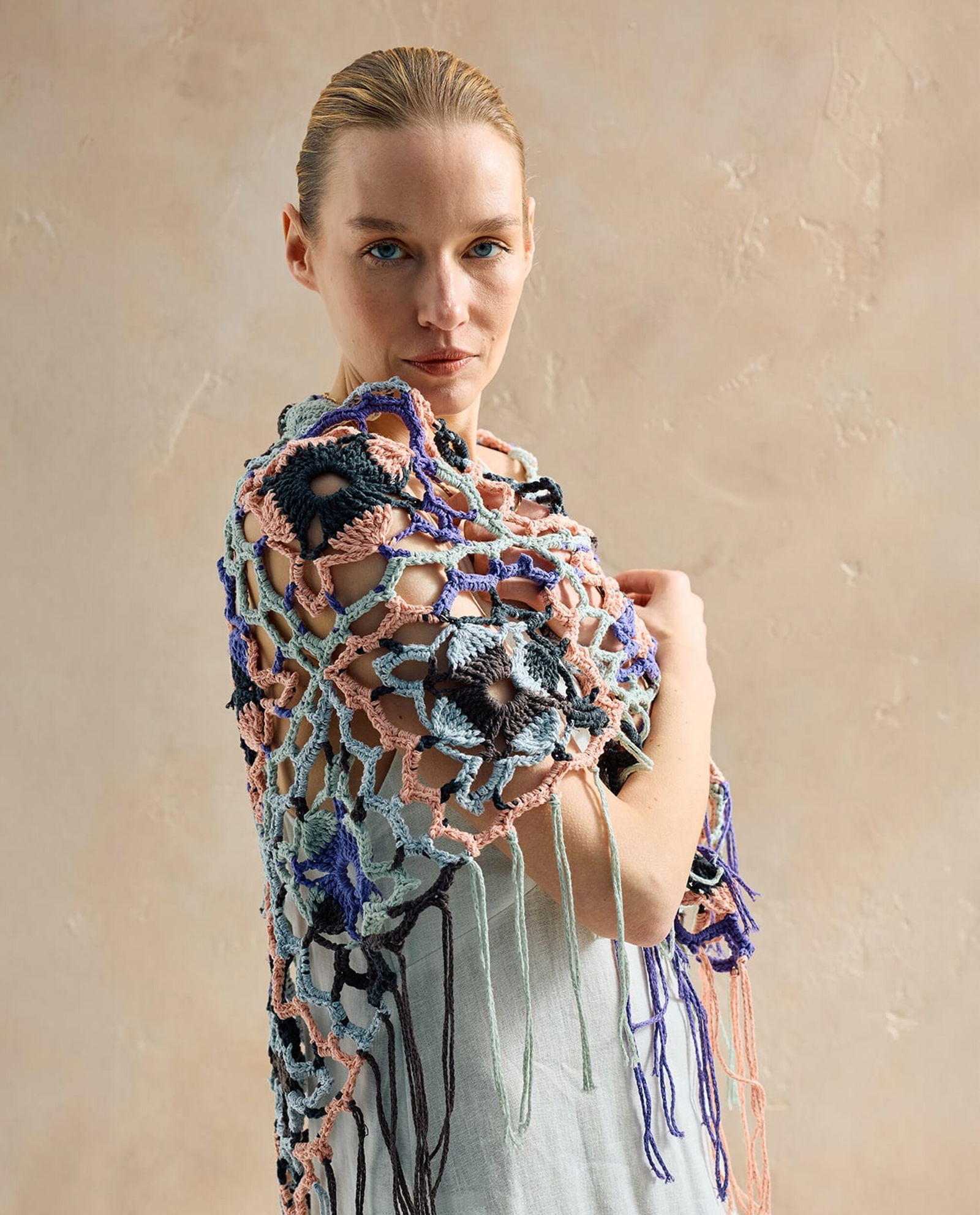 omslagdoek in openhaakwerk met bloemen gemaakt van Boeken Phildar