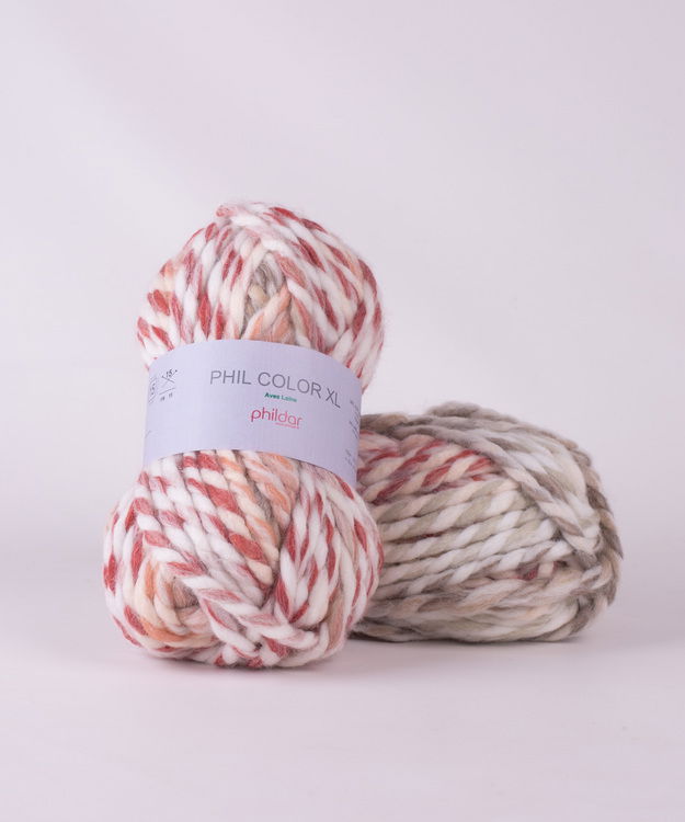 Phildar Color XL is een luchtig gewikkelde draad van naturel en in kleurafstekend acryl met wollen draad. Het dikke breigaren is geschikt voor breinaalddikte nr 15 Breisels van het XL garen hebben een wollig en iets harig uiterlijk.