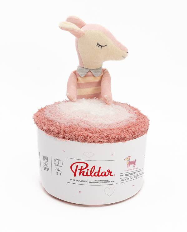 Phildar Phil doudou, super zacht en donzig garen met een verloop in kleuren. Speciaal gemaakt voor baby kleding en accesoires. 1 bol is voldoende voor 1 deken, bij de bol een gratis superzachte knuffel.