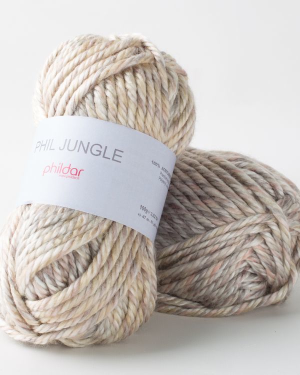 Phildar Phil Jungle is een dik gemêleerd garen voor pendikte 9, een mooi garen voor het breien van dikkere accessoires.