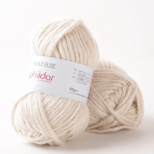 Phildar Nebuleuse is een dik, luchtig en licht garen met veel volume. Nebuleuse is verkrijgbaar in verschillende licht gebleekte kleuren en geeft breiwerk een stoere uitstraling. Phildar heeft een groot aantal breipatronen gemaakt met het garen, waaronder kindermuts, sjaal, damesvest, trappelzak, cape, snood en nog veel meer.