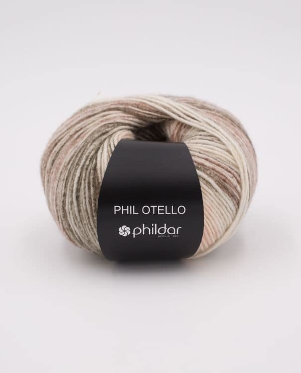 Phildar Phil Otello is een meer kleurige draad van 100% merino. De draad is enkel gewikkeld en heeft een licht verloop in dikte.