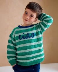 Gestreepte kindertrui met tekst gemaakt van Phildar Phil Soft Cotton