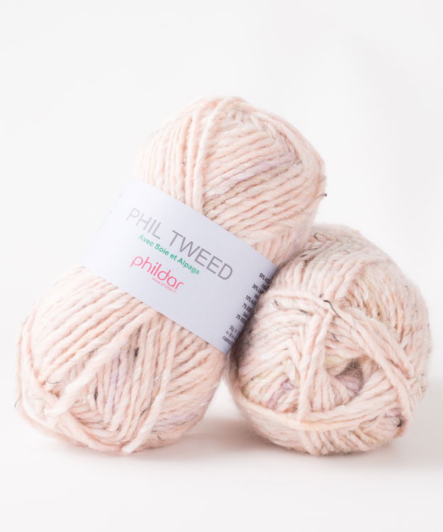 Phil tweed van Phildar is een licht gemeleerd garen, is iets harig en heerlijk zacht. De draad is enkel gewikkeld en daardoor soepel en luchtig, de haren van het garen zitten vrij los in de draad. Door de toevoeging van zijde heeft de draad een licht glans, dit in combinatie met de haren geeft de draad een fraai uitelijk.