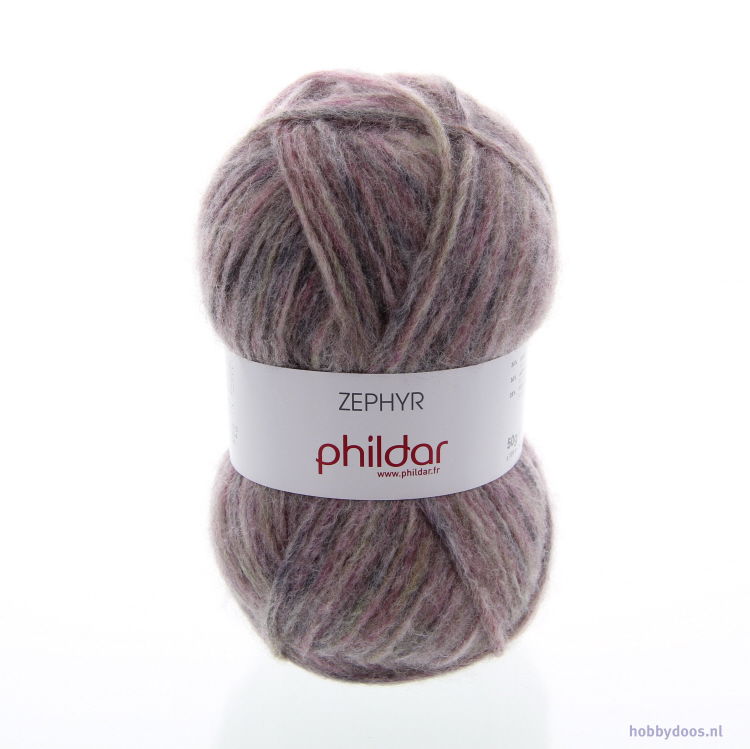 Zephyr van Phildar, fijne garen dat iets vervilt is, wat het garen een donsige uitstraling geeft. Daar tegenover geven de subtiele kleur nuances het garen een stoer uiterlijk.