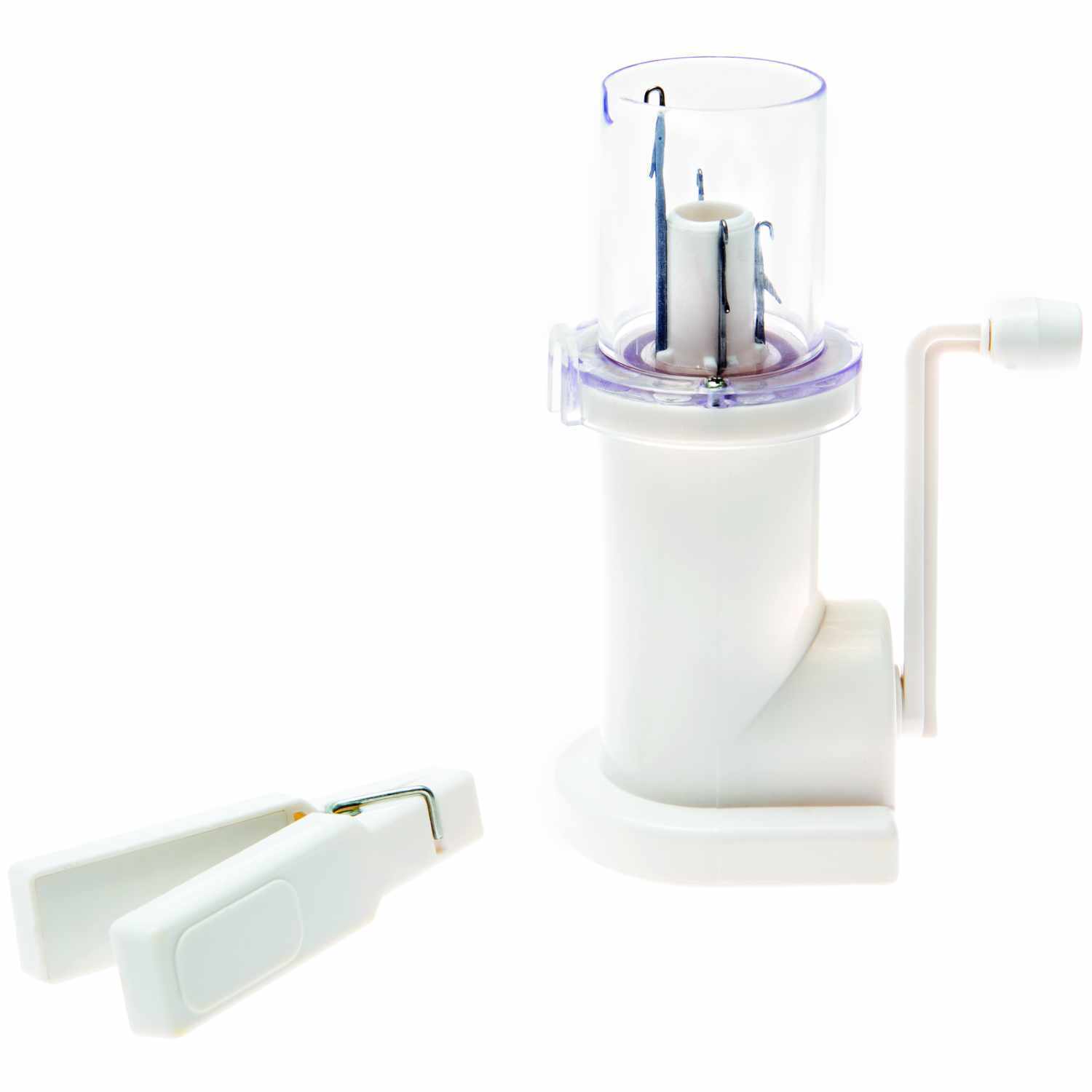 Met de kleine halfautomatische breimolen is het eenvoudig en snel koorden te breien. Nadat je de draad door de onderste en buitenste draadgeleider hebt geleid, laat je deze door de middelste schacht van de breimolen glijden. De volgorde van de haken hoeft alleen tijdens de eerste ronde in acht te worden genomen. Dan kun je hem gewoon aandraaien. Dankzij het meegeleverde gewicht glijdt het koord uit de onderkant van de molen. Zodra de gewenste lengte is bereikt, kan de slang verder worden verwerkt. Voor mooie belettering kun je het beste een stevige draad gebruiken.
