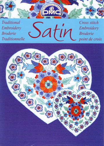 Satin - bloemen in het blauw met rood, borduurpatronen. Het motief is zowel in platsteken als in kruissteken omschreven.