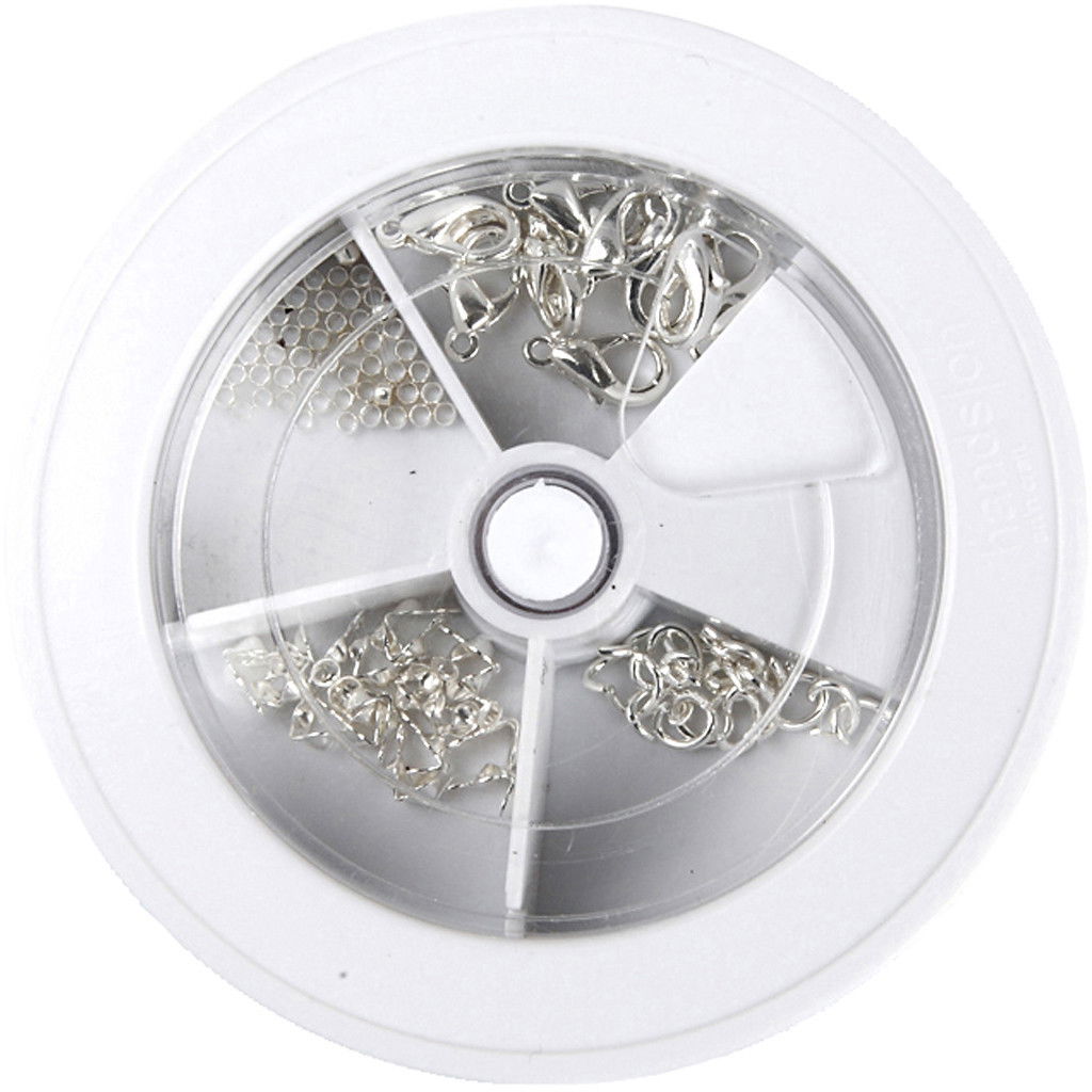 Deze kit bevat alle onderdelen nodig om sieraden mee af te werken en aan elkaar te maken met gebruik van sieradendraad - het perfecte startpakket. Inhoud: 10 karabijnsluitingen, 50 knijpkralen, 20 kalotjes, 20 ringen rond en 5 m sieradendraad .