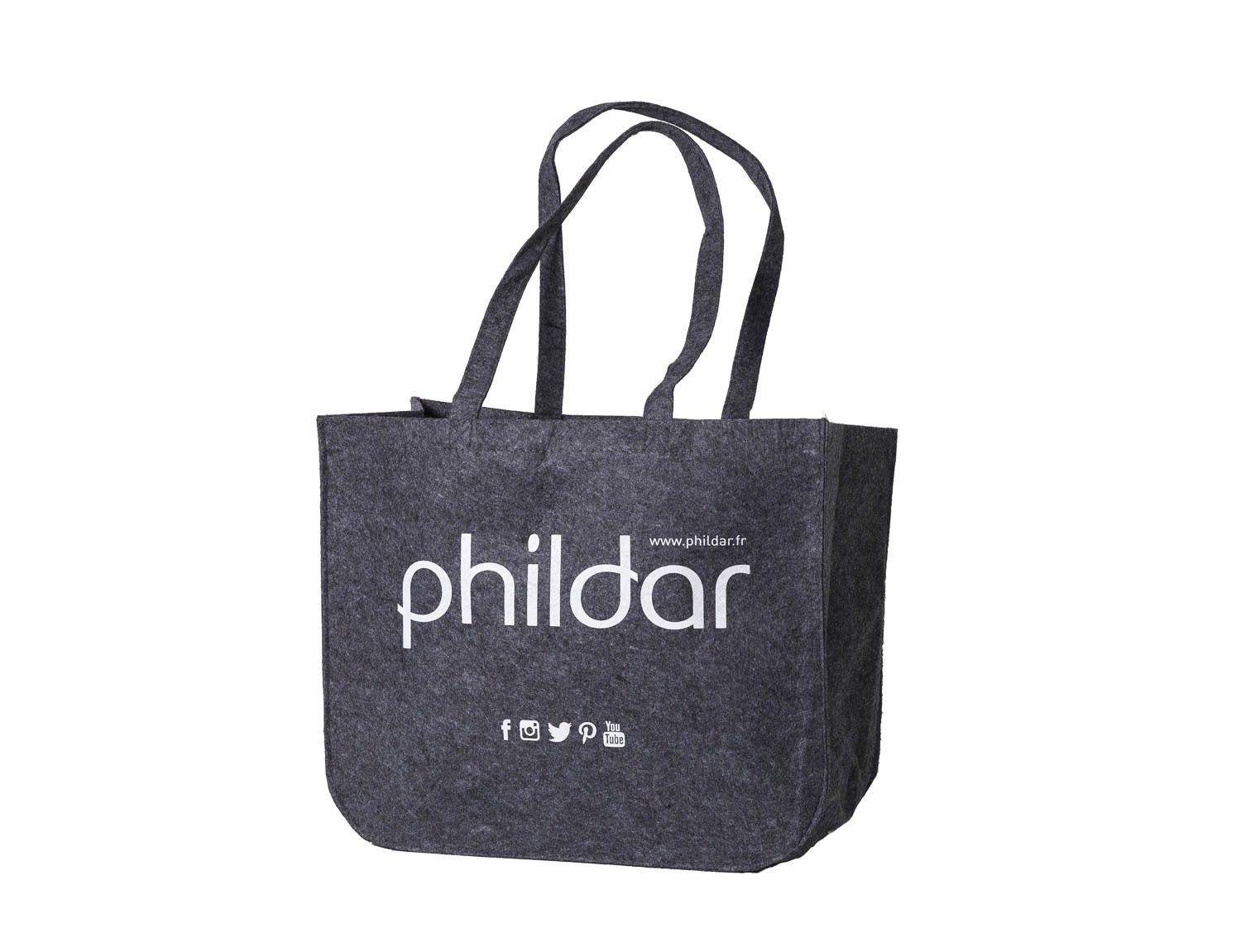 Phildar tas van dik grijs gevilte stof, lekker ruim en stevig. Blijft uit zichzelf staan, waardoor hij zeer geschikt is voor als handwerktas.