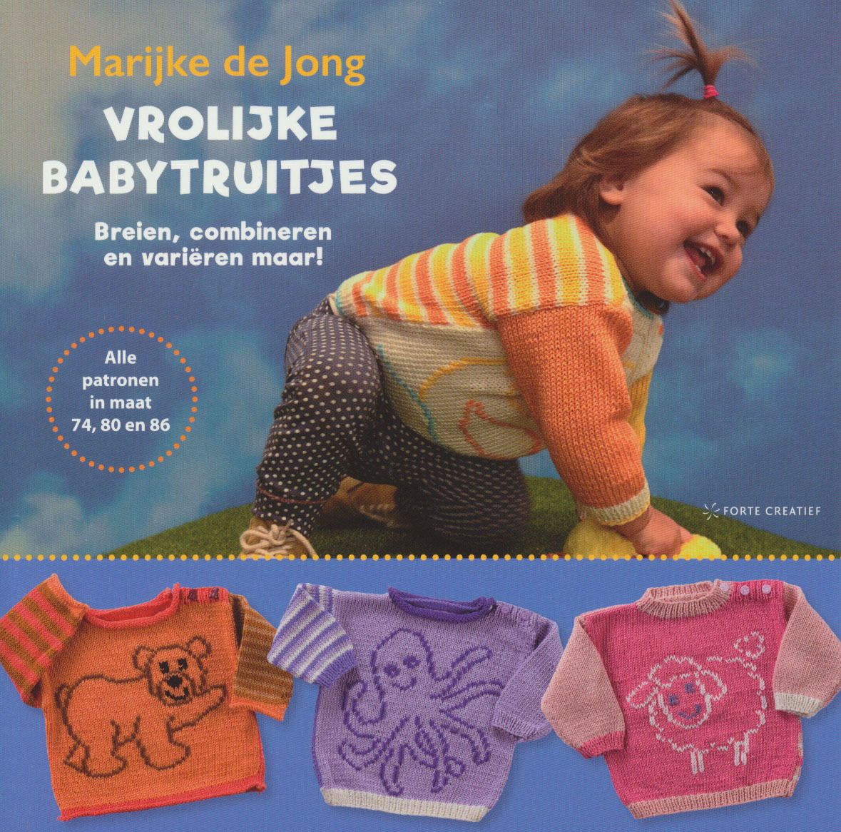 In het boek: Vrolijke babytruitjes, breien, combineren en variëren maar, een basis patroon van een babytruitje in de maten 74, 80 en 86. Verschillende kleuren combinaties en 15 verschillende maasmotieven van dieren, voor het breien van de schattigste babytruitjes.