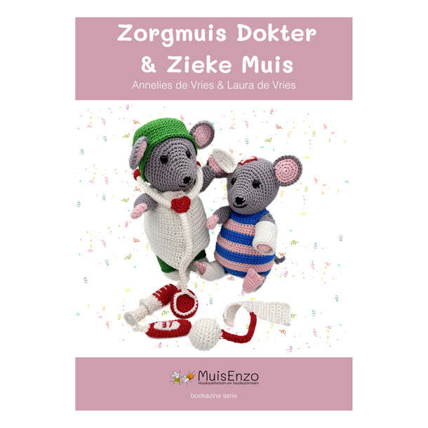 Haakpatroon muizendokter met instrumeneten en gewonde muis.